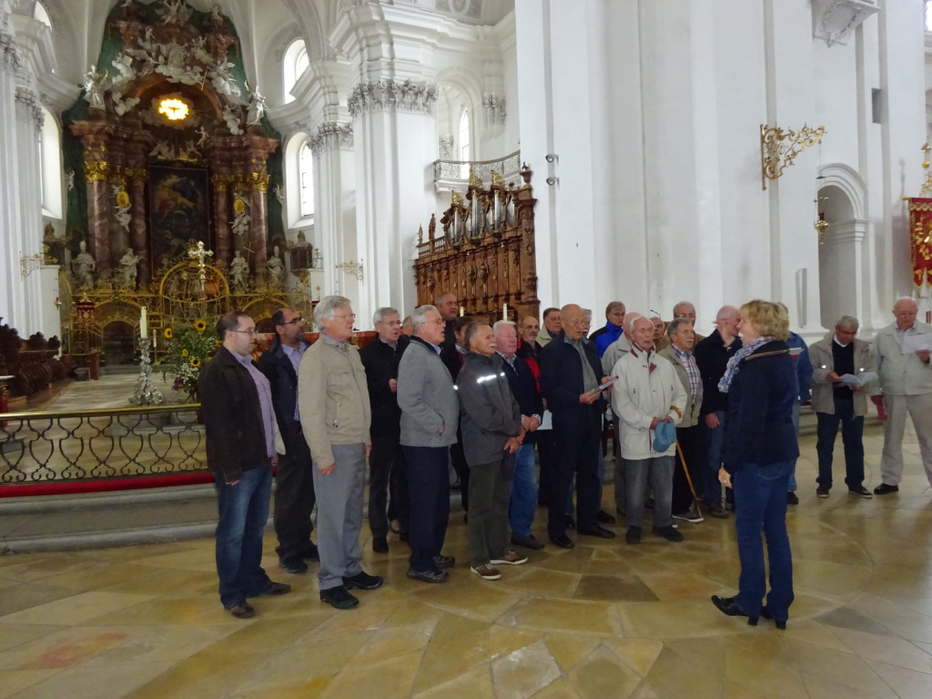 Weiter ging es nach Weingarten. Hier erwartete uns August Schuler, seines Zeichens Geologe, Wirt, Lokalpolitiker im Großraum Ravensburg und vor allem der Schwager der Schwiegertochter von Sängerkamerad Carl Friedrich Bock. Er führte die Männer ein wenig durch die bekannte Basilika und machte nebenbei einen kleinen Ausflug in die Geschichte der Region und des Welfenhauses, übrigens Vorfahren des Britischen Königshauses. Und natürlich ließ es sich der Chor mit seiner mitgereisten Chorleiterin Brigitte Neumann nicht nehmen, in diesem unglaublichen Bau zu singen. Organist und Orgelstimmer unterbrachen hierfür extra kurz ihre Arbeit und so konnte die herrliche Akustik voll genossen werden. Es blieb dann aber bei zwei Liedern, denn zum einen ging es für den Männerchor zum nächsten Programmpunkt, zum anderen musste der Orgelstimmer weiterarbeiten, denn abends stand der Windsbacher Knabenchor auf dem Programm der Basilika.