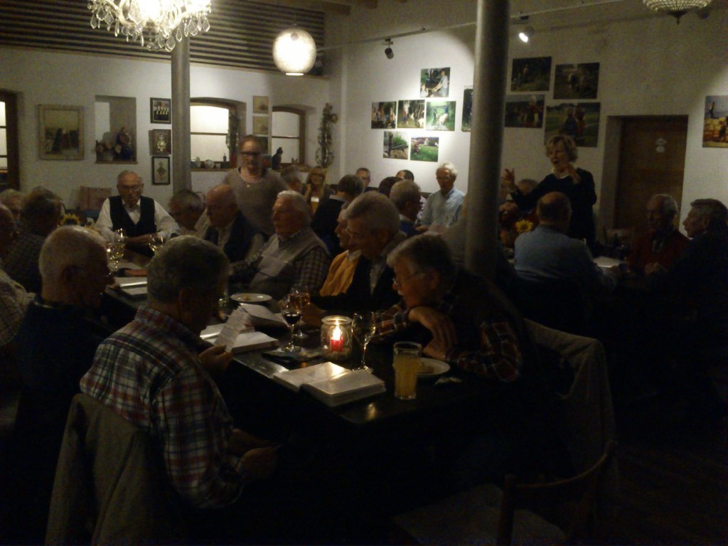Anschließend ging es in die nur wenige Kilometer entfernte Gemeinde Berg-Bachmaier und dort in die nach dem Teilort benannte Ausflugsgaststätte Bachmaier. Beim Hof, zu dem die Gaststätte gehört, handelt es sich um das Elternhaus von August Schulers Frau und deren Schwester, also Carl Friedrichs Schwiegertochter, Christine. Als kleine Überraschung waren Christine und Hans-Joachim Bock extra aus Eningen angereist und so war der Empfang noch herzlicher, als er dort in der Wirtschaft eh schon ist. Hier erwartete den Männerchor bereits ein großes und vor allem leckeres schwäbisches Buffet. Bestens gestärkt wurde dann noch viel gesungen, bevor man sich gegen 20:30 Uhr – wenn auch nicht ganz freiwillig – wieder auf den Rückweg nach Eningen machte.