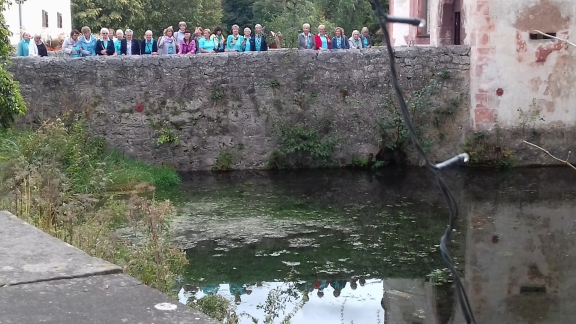 Nächstes Ziel: Das imposante Wasserschloss Sulz-Glatt im oberen Neckarraum – eine der besterhaltenen Schlossanlagen des ganzen Landes. Im November 2001 wurde dort ein Kultur- und Museumszentrum eröffnet. Dabei sehenswert die Rüstkammer, wo Waffen, diverse Rüstungen, Utensilien vom Kettenhemd bis zum Keuschheitsgürtel und sogar ein Ritter hoch zu Ross zu bewundern sind. Auf anderer Ebene sind die politischen und gesellschaftlichen Aspekte adeliger Herrschaft dokumentiert. Die Galerie, quasi das „Schaufenster der Kunst“ umfasst in einer Dauerausstellung rund 170 Exponate namhafter Künstler, z.b. HAP Grieshaber . Angeschlossen ist auch ein Bauernmuseum – den Sängerinnen alles nahegebracht durch einen besonders kompetenten Führer. Im historischen Schloss-Cafe, wo jeder Raum anders möbliert ist, stärkten sich die Eningerinnen jetzt mit riesigen Kuchen- und Tortenstücken.