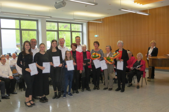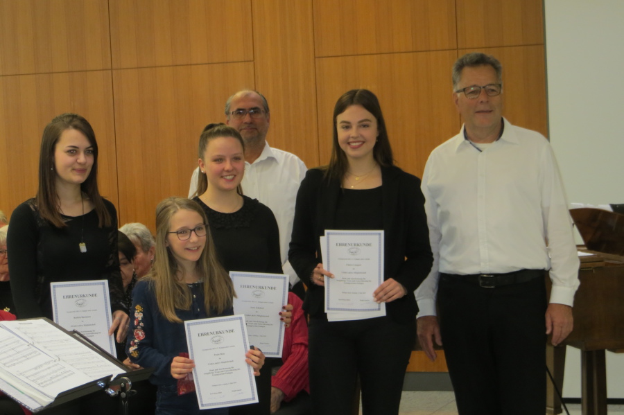 Als erster Ehrungsblock stand die Vereinsjugend im Mittelpunkt. Für 10 Jahre Mitgliedschaft im Verein konnten Anne Schobert und Kathrin Bussmann geehrt werden. Kathrin erhielt zudem noch nachträglich die Ehrung für 5 Jahre, da diese am eigentliche Ehrungstermin untergegangen war. Terminlich leider verhindert war Gina-Marie Bross, die ebenfalls für 10 Jahre geehrt worden wäre. Für 5 Jahre Mitgliedschaft im Verein wurden Chiara Langner und Paula Hoss geehrt. Als kleine Auflockerung sangen die 5 Achalmfinken „Can't help falling in love“, am bekanntesten vermutlich von Elvis Presley. Den Abschluss des Jugendblocks bildeten music and more gemeinsam mit den Achalmfinken beim „Hallelujah“ von Leonard Cohen.