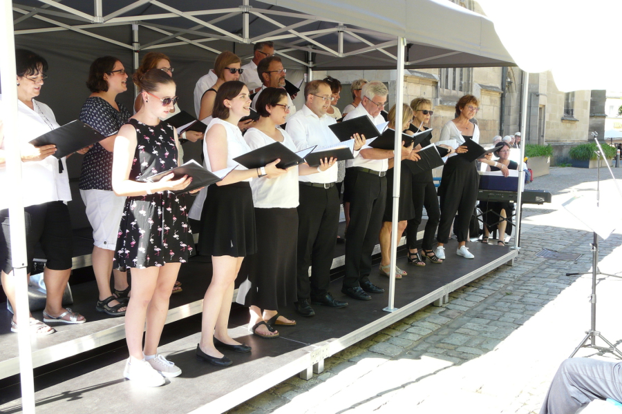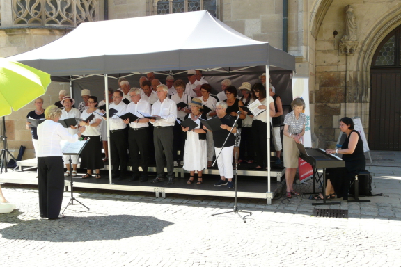 Die Eninger Sängerinnen und Sänger präsentierten noch einmal das Programm aus Heilbronn. Auftrittsort war der Vorplatz der Schorndorfer Stadtkirche und zum Glück überdacht. Und auch die Zuhörer hatten schattige Plätzchen unter den umliegenden Bäumen.