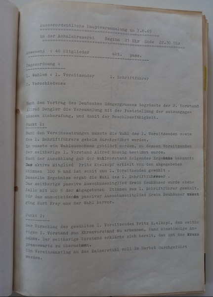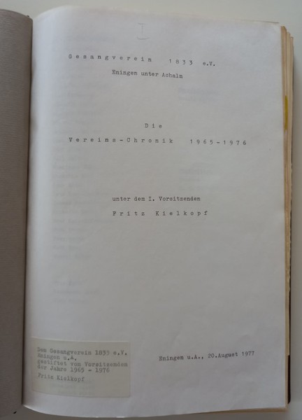 Als Fritz am 9. Mai 1947 in den Verein eintrat, hieß dieser noch Männergesangverein Eningen. Dass man ihn heute als Gesangverein 1833 e.V. Eningen unter Achalm kennt, ist auch Fritz zu verdanken. In seine Vorstandschaft von 1965 bis 1976 fiel die Gründung des Frauenchores und somit auch die Umbenennung des Vereins. Hier hatte er einige Überzeugungsarbeit zu leisten, denn nicht alle Männer waren davon begeistert, dass jetzt auch „d' Weiber“ singen wollen – aber man sieht, sein Einsatz hat sich gelohnt, den Frauenchor gibt es noch heute.