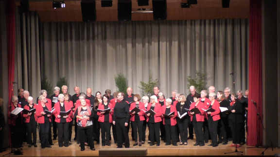 Der musikalische Abschluss des Abends oblag natürlich dem Frauenchor, unterstützt von music and more mit „Mit gute Nacht Freunde“. Und da der Text mit „einem letzten Glas im Stehn“ endet, ließ es sich der Männerchor nicht nehmen, genau dieses Glas zu servieren – verbunden mit einem Toast von Holger Schosser, was vom Chor dankbar angenommen wurde, hat man doch nach einem Konzert einen trockenen Mund, und stand noch der lang anhaltende Applaus und die Dankadressen an. Diese gingen an die Solisten, Pianistin Katja Smyka und alle im Hintergrund Beteiligten, vom Aufbau über die Deko bis zum Bewirtungsteam. Ebenfalls eine kleine Aufmerksamkeit – nämlich eine Rose, gespendet von Goldlauf – gab es für die anwesenden Gründungsmitglieder des Frauenchores. Der größte Dank aber ging auch bei diesem Konzert an Chorleiterin Brigitte Neumann, die auch für den Abend die musikalische Gesamtleitung inne und viel Arbeit in das gelungene Komnzert gesteckt hatte. Und natürlich durften die Chöre nicht ohne Zugabe von der Bühne gehen; es gab noch einmal „Gute Nacht Freunde“, wobei dieses Mal auch der Männerchor mit einstimmte, bevor der Abend anschließend auch für das Publikum noch beim einen oder anderen Glas ausklang.