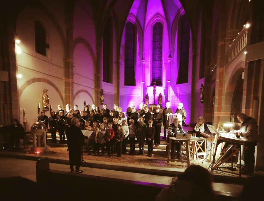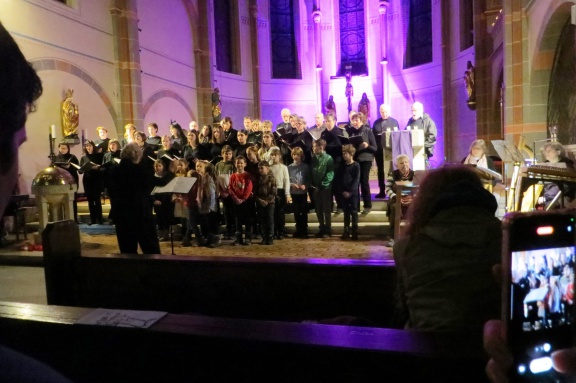 Dann hatten die Achalmfinken ihren ersten großen Einsatz mit „Wir sagen euch an, den lieben Advent“, wobei die Strophen toll von kleinen Solistengruppen vorgetragen wurden – ganz schön mutig vor einer vollen Kirche. Zum „O Tannenbaum“ gesellte sich dann music and more wieder zum Chornachwuchs., gefolgt von „Es ist für uns eine Zeit angekommen“.