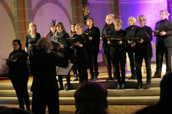 Ein Musikstück von Pianistin Katja Smyka und Violinistin Gunhild Liebchen gab den Männern von music and more Gelegenheit, schon einmal auf die Empore zu gehen, denn für die nächsten beiden Lieder im Altarraum waren nur noch die Frauenstimmen nötig, beim „Maria durch ein Dornwald ging“ Solistin Isabell Neumann mit dem Chor und bei „Als Maria übers Gebirge ging“ ein Trio aus Isabell Neumannm Rosalie Hehl und Silke Sautter.