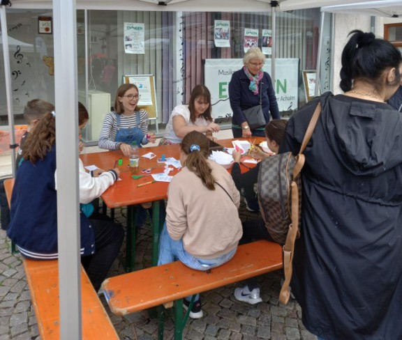 Es gab unsere leckeren Waffeln, ein Bastelangebot und ein lebendiges Musik-Memory. Gebastelt wurden kleine Vögel, um genau zu sein Achalmfinken; wahnsinn, wie bunt die Ergebnisse waren. Beim lebendigen Musik-Memory hatten sich immer zwei unserer Achalmfinken ein gemeinsames Lied ausgesucht. Dann wurden unsere Sängerinnen und Sänger bint gemischt. Die Kandidaten mussten nun die beiden Kinder finden, die dasselbe Lied hatten; nur eben nicht wie beim echten Memory durch Karten umdrehen, sondern durch anstupsen der Sängerinnen und Sänger, die dann kurz ihr Lied ansangen - ein Spaß für beide Seiten.