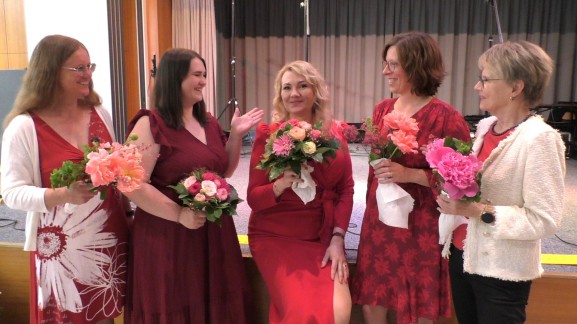 Zum Schluss galt es nun noch, Danke zu sagen. Zum einen an die bereits im Text erwähnten Protagonisten, aber auch an den Chor und die vielen helfenden Hände im Hintergrund. Ein besonderer Dank ging an Gert Kürner von der Musikschule Hoffnungsland, der sich um die professionelle Tontechnik gekümmert hatte, an Ulf Gökeler am Schlagzeug und an Katja Smyka am Klavier, die den Gesangverein bereits seit vielen Jahren begleitet. Der größte Dank ging aber an Chorleiterin Ana Sorocean, Ideengeberin und musikalische Organisatorin des gesamten Abends.