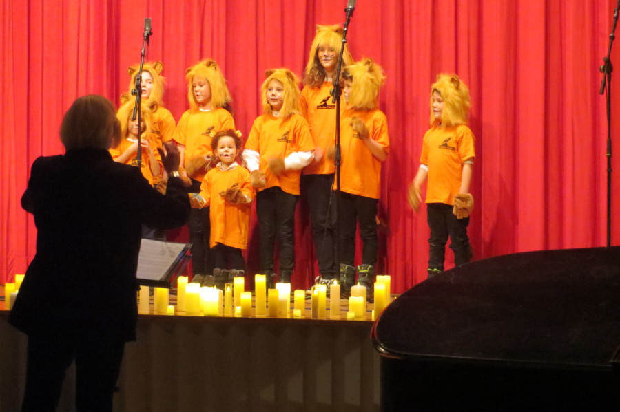 Als der Vorhang aufging, hatten hier schon etwas größere Löwen, auch bekannt als music and more, Stellung bezogen. Mit Chorleiterin Ana Sorocean und sichtlich Spaß gaben sie ein Medley mit den schönsten Melodien aus dem “König der Löwen” zum Besten. Währendessen schlich das kleine Löwenrudel unter Anführung vom Oberlöwen Rebecca Hummel durchs Publikum.